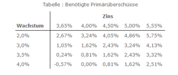 Aber wie realistisch sind diese immer wieder revidierten Modellrechnungen? Der benötigte Primärüberschuss, also die Differenz aus Einnahmen und Ausgaben des Staates vor Zinszahlungen, der die griechische Schuldenquote zumindest stabil halten würde, ist in hohem Maße abhängig von der Höhe des Wirtschaftswachstums und vom Zins, zu dem sich der Staat verschulden kann. Der IWF unterstellt langfristig ein durchschnittliches nominales Wachstum von etwa 3 Prozent. Für den Rest der Dekade ist der Zinssatz durch die beschlossenen Rettungsmaßnahmen überwiegend fixiert und liegt 2 Prozentpunkte über dem Zinssatz deutscher zehnjähriger Staatsanleihen von etwa 2 Prozent. Angenommen nach dem Jahr 2020 wären Anleger bereit, Griechenland auch weiterhin zu diesem Zins Kredite zu gewähren, dann benötigte der Staat einen Primärüberschuss von 1,6 Prozent des BIP, nur um die Schulden nicht ansteigen zu lassen. Da die Troika ab 2014 sogar von 4,5 Prozent ausgeht, scheinen die Rettungspläne durchführbar zu sein. Hierbei verlässt man sich offensichtlich auch auf hohe Privatisierungserlöse.
