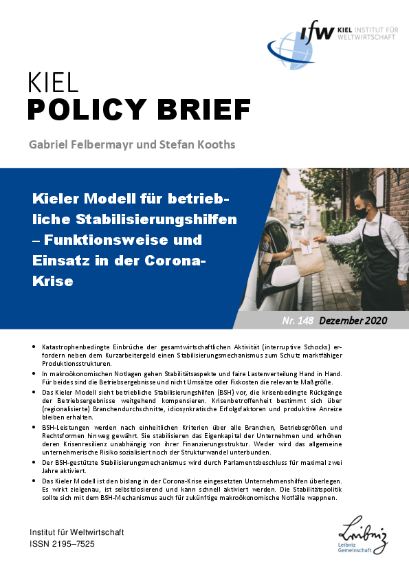Katastrophenbedingte Einbrüche der gesamtwirtschaftlichen Aktivität erfordern neben dem Kurzarbeitergeld einen Stabilisierungsmechanismus zum Schutz marktfähiger Produktionsstrukturen. In makroökonomischen Notlagen gehen Stabilitätsaspekte und faire Lastenverteilung Hand in Hand. Für beides sind die Betriebsergebnisse und nicht Umsätze oder Fixkosten die relevante Maßgröße. Vor diesem Hintergrund schlagen die Autoren ein Kieler Modell für betriebliche Stabilisierungshilfen (BSH) vor, um die krisenbedingten Rückgänge der Betriebsergebnisse weitgehend zu kompensieren. Krisenbetroffenheit bestimmt sich über (regionalisierte) Branchendurchschnitte, während idiosynkratische Erfolgsfaktoren und produktive Anreize erhalten bleiben. Die BSH-Leistungen werden nach einheitlichen Kriterien über alle Branchen, Betriebsgrößen und Rechtsformen hinweg gewährt. Sie stabilisieren das Eigenkapital der Unternehmen und erhöhen deren Krisenresilienz unabhängig von ihrer Finanzierungsstruktur. Weder wird das allgemeine unternehmerische Risiko sozialisiert noch der Strukturwandel unterbunden. Der BSH-gestützte Stabilisierungsmechanismus wird durch Parlamentsbeschluss für maximal zwei Jahre aktiviert. Das Kieler Modell ist den bislang in der Corona-Krise eingesetzten Unternehmenshilfen überlegen, da es zielgenau wirkt, selbstdosierend ist und schnell aktiviert werden kann. Die Autoren empfehlen, dass sich die Stabilitätspolitik mit dem BSH-Mechanismus auch für zukünftige makroökonomische Notfälle wappnen sollte.