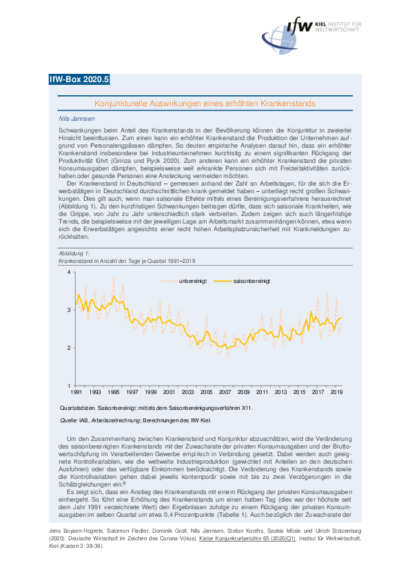 Schwankungen beim Anteil des Krankenstands in der Bevölkerung können die Konjunktur in zweierlei Hinsicht beeinflussen. Zum einen kann ein erhöhter Krankenstand die Produktion der Unternehmen aufgrund von Personalengpässen dämpfen. So deuten empirische Analysen darauf hin, dass ein erhöhter Krankenstand insbesondere bei Industrieunternehmen kurzfristig zu einem signifikanten Rückgang der Produktivität führt. Zum anderen kann ein erhöhter Krankenstand die privaten Konsumausgaben dämpfen, beispielsweise weil erkrankte Personen sich mit Freizeitaktivitäten zurückhalten oder gesunde Personen eine Ansteckung vermeiden möchten.