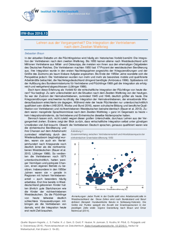 In der aktuellen Debatte um die Flüchtlingskrise wird häufig ein historisches Vorbild bemüht: Die Integration der Vertriebenen nach dem zweiten Weltkrieg. Bis 1950 kamen alleine nach Westdeutschland acht Millionen Vertriebene aus Mittel- und Osteuropa, die meisten von ihnen aus den ehemaligen Ostgebieten des Deutschen Reiches. Die Vertriebenen machten 1950 fast 17 Prozent der westdeutschen Bevölkerung aus. Ihre Integration wurde in den ersten Nachkriegsjahren angesichts der Kriegszerstörungen und der Größe des Zustroms als kaum lösbare Aufgabe angesehen. Bis Ende der 1950er Jahre wandelte sich die Perspektive jedoch: Die Vertriebenen wurden nun mehr und mehr als besonders mobile und qualifizierte Arbeitskräfte betrachtet, die Nachkriegsdeutschland dringend benötigte. Spätestens mit der Auflösung des Bundesministeriums für Vertriebene und Flüchtlinge 1969 galt die Integration als erfolgreich und weitgehend abgeschlossen.