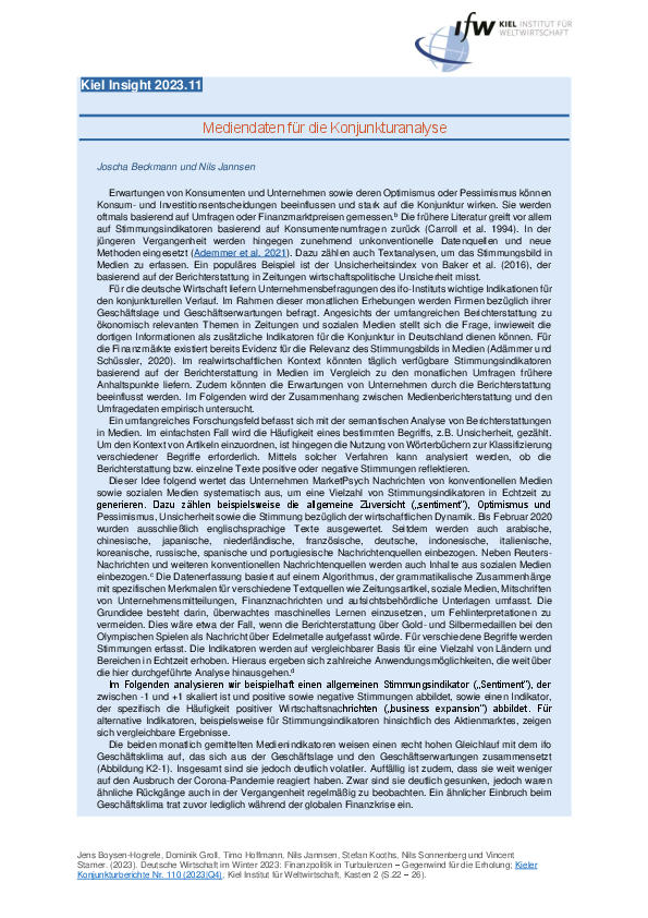Erwartungen von Konsumenten und Unternehmen sowie deren Optimismus oder Pessimismus können Konsum- und Investitionsentscheidungen beeinflussen und stark auf die Konjunktur wirken. Sie werden oftmals basierend auf Umfragen oder Finanzmarktpreisen gemessen. Für die deutsche Wirtschaft liefern Unternehmensbefragungen des ifo-Instituts wichtige Indikationen für den konjunkturellen Verlauf. Angesichts der umfangreichen Berichterstattung zu ökonomisch relevanten Themen in Zeitungen und sozialen Medien stellt sich die Frage, inwieweit die dortigen Informationen als zusätzliche Indikatoren für die Konjunktur in Deutschland dienen können. Im realwirtschaftlichen Kontext könnten täglich verfügbare Stimmungsindikatoren basierend auf der Berichterstattung in Medien im Vergleich zu den monatlichen Umfragen frühere Anhaltspunkte liefern. Zudem könnten die Erwartungen von Unternehmen durch die Berichterstattung beeinflusst werden. Im Folgenden wird der Zusammenhang zwischen Medienberichterstattung und den Umfragedaten empirisch untersucht.