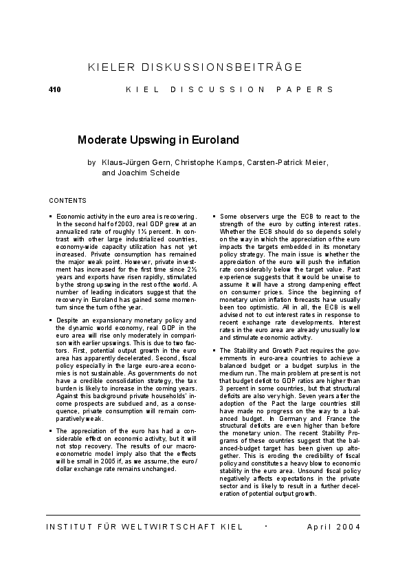 In the spring of 2004, the euro-area economy is on the road of recovery. While the previous stagnation has been overcome, one cannot speak of a true upswing. In fact, real GDP rose by a little less than 1½ percent in the second half of last year. Capacity utilization has not yet increased which is in contrast to the recent development of other major industrial countries. The weak spot has been private consumption which has only stagnated so far. However, fixed investment went up for the first time in 2½ years. A strong support for the upturn came from abroad. Since production in the rest of the world has risen sharply, exports have shown a strong performance although the euro appreciation has had a negative impact.