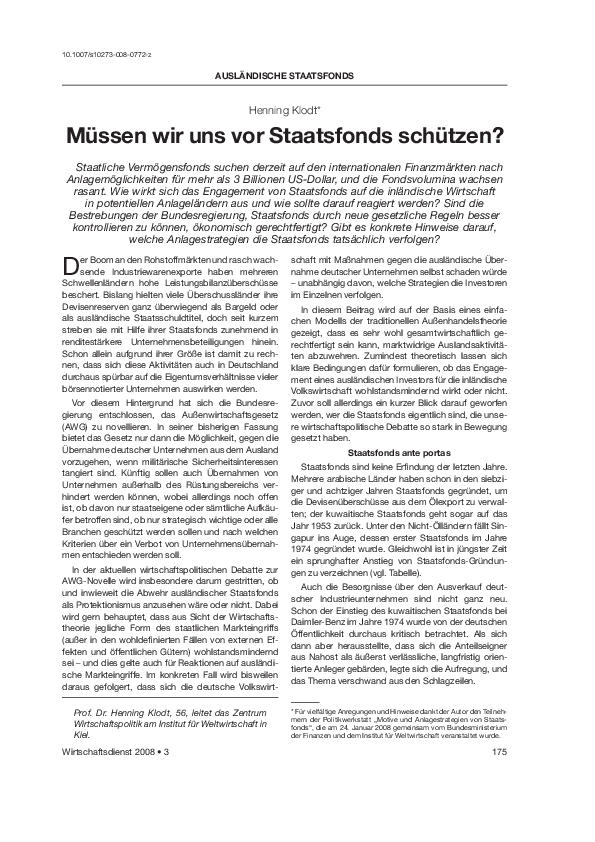 Staatliche Vermögensfonds suchen derzeit auf den internationalen Finanzmärkten nach Anlagemöglichkeiten für rund drei Billionen US-Dollar, und die Fondsvolumina wachsen rasant. Für potentielle Anlageländer wie Deutschland gewinnt damit die Frage an Bedeutung, wie sich das Engagement von Staatsfonds auf die inländische Wirtschaft auswirken könnte und wie darauf reagiert werden sollte. Sind die Bestrebungen der Bundesregierung, Staatsfonds durch neue gesetzliche Regeln besser kontrollieren zu können, ökonomisch gerechtfertigt? Und gibt es konkrete Hinweise darauf, welche Anlagestrategien die Staatsfonds tatsächlich verfolgen?