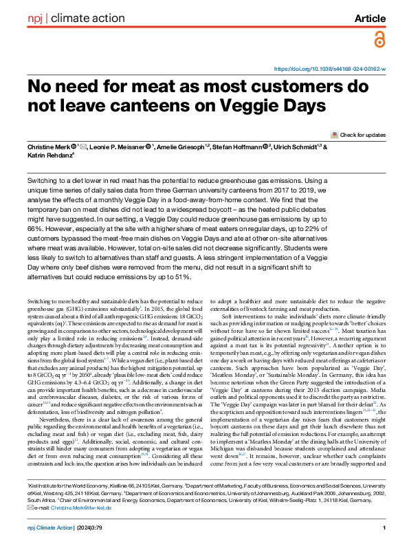 Switching to a diet lower in red meat has the potential to reduce greenhouse gas emissions. Using a unique time series of daily sales data from three German university canteens from 2017 to 2019, we analyse the effects of a monthly Veggie Day in a food-away-from-home context. We find that the temporary ban on meat dishes did not lead to a widespread boycott – as the heated public debates might have suggested. In our setting, a Veggie Day could reduce greenhouse gas emissions by up to 66%. However, especially at the site with a higher share of meat eaters on regular days, up to 22% of customers bypassed the meat-free main dishes on Veggie Days and ate at other on-site alternatives where meat was available. However, total on-site sales did not decrease significantly. Students were less likely to switch to alternatives than staff and guests. A less stringent implementation of a Veggie Day where only beef dishes were removed from the menu, did not result in a significant shift to alternatives but could reduce emissions by up to 51%.