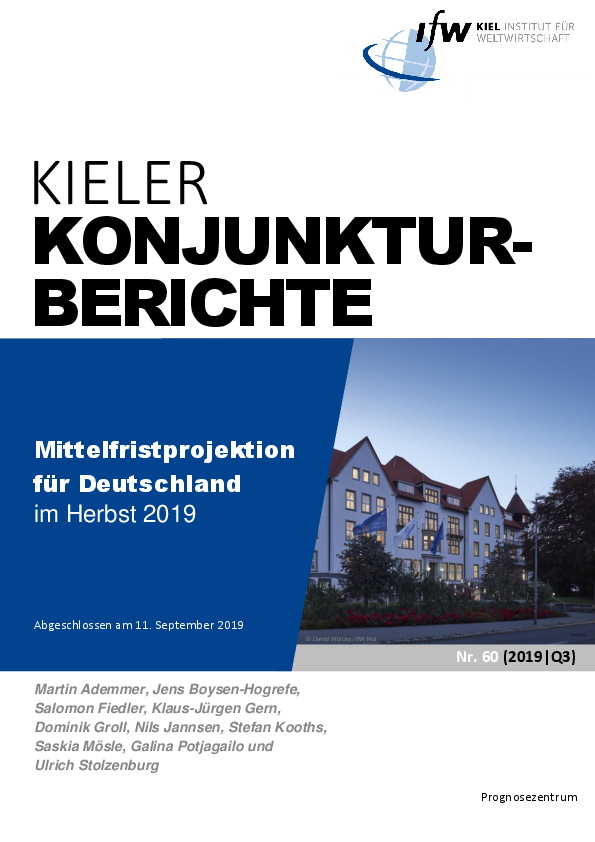 Das Wachstum des Produktionspotenzials, also das bei Normalauslastung aller Produktionsfaktoren erzielbare Bruttoinlandsprodukt, lässt zunehmend nach und dürfte in der Mitte des kommenden Jahrzehnts nur noch rund 1 Prozent betragen. Aufgrund der Alterung der Bevölkerung gehen von der Entwicklung des Arbeitskräfteangebots erst kaum noch positive und zum Ende der Mittelfrist sogar negative Impulse auf das Potenzialwachstum aus. Nachdem das Bruttoinlandsprodukt in den vergangenen Jahren deutlich oberhalb des Produktionspotenzials lag, wird sich die Produktionslücke unserer Schätzung zufolge im laufenden Jahr nahezu schließen. Ausgehend von in etwa normal ausgelasteten Kapazitäten in der kurzen Frist rechnen wir mit einer leichten Beschleunigung der Konjunktur in der mittleren Frist. Gleichwohl wird die Konjunktur in Deutschland in den kommenden Jahren wohl nur wenig Dynamik entfalten.
