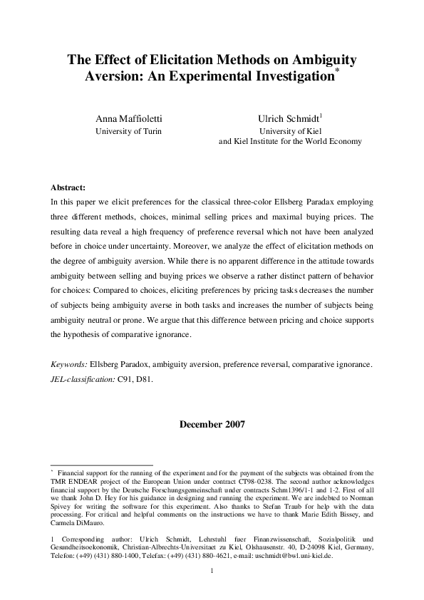 In this paper we elicit preferences for the classical three-color Ellsberg Paradax employing three different methods, choices, minimal selling prices and maximal buying prices. The resulting data reveal a high frequency of preference reversal which not have been analyzed before in choice under uncertainty. Moreover, we analyze the effect of elicitation methods on the degree of ambiguity aversion. While there is no apparent difference in the attitude towards ambiguity between selling and buying prices we observe a rather distinct pattern of behavior for choices: Compared to choices, eliciting preferences by pricing tasks decreases the number of subjects being ambiguity averse in both tasks and increases the number of subjects being ambiguity neutral or prone. We argue that this difference between pricing and choice supports the hypothesis of comparative ignorance.