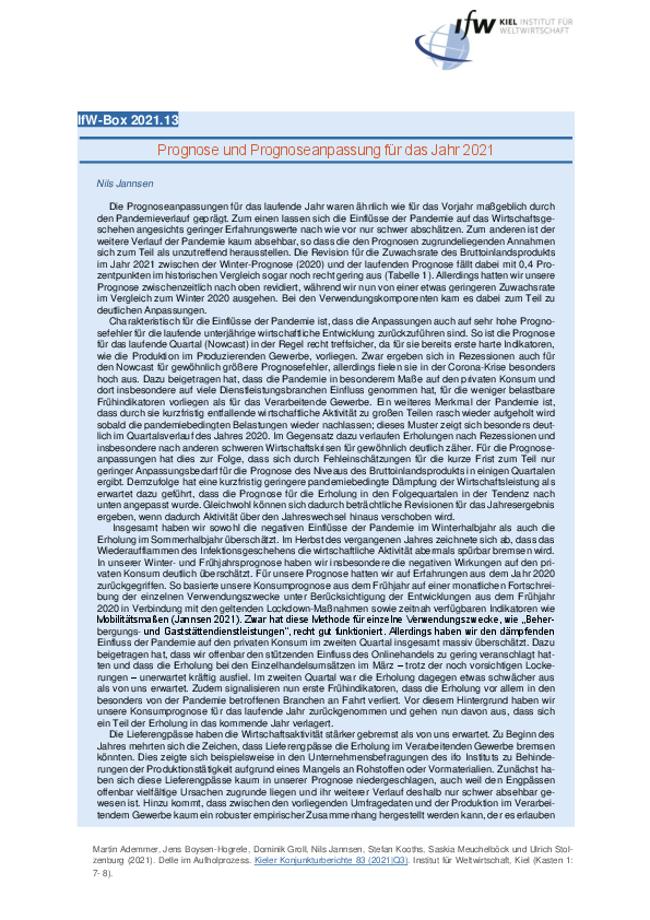 Die Prognoseanpassungen für das laufende Jahr waren ähnlich wie für das Vorjahr maßgeblich durch den Pandemieverlauf geprägt. Zum einen lassen sich die Einflüsse der Pandemie auf das Wirtschaftsgeschehen angesichts geringer Erfahrungswerte nach wie vor nur schwer abschätzen. Zum anderen ist der weitere Verlauf der Pandemie kaum absehbar, so dass die den Prognosen zugrundeliegenden Annahmen sich zum Teil als unzutreffend herausstellen. Die Revision für die Zuwachsrate des Bruttoinlandsprodukts im Jahr 2021 zwischen der Winter-Prognose (2020) und der laufenden Prognose fällt dabei mit 0,4 Prozentpunkten im historischen Vergleich sogar noch recht gering aus (Tabelle 1). Allerdings hatten wir unsere Prognose zwischenzeitlich nach oben revidiert, während wir nun von einer etwas geringeren Zuwachsrate im Vergleich zum Winter 2020 ausgehen. Bei den Verwendungskomponenten kam es dabei zum Teil zu deutlichen Anpassungen.