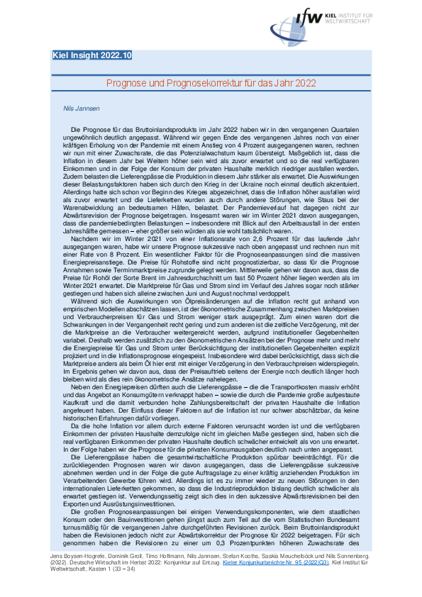 Die Prognose für das Bruttoinlandsprodukts im Jahr 2022 haben wir in den vergangenen Quartalen ungewöhnlich deutlich angepasst. Während wir gegen Ende des vergangenen Jahres noch von einer kräftigen Erholung von der Pandemie mit einem Anstieg von 4 Prozent ausgegangenen waren, rechnen wir nun mit einer Zuwachsrate, die das Potenzialwachstum kaum übersteigt. Maßgeblich ist, dass die Inflation in diesem Jahr bei Weitem höher sein wird als zuvor erwartet und so die real verfügbaren Einkommen und in der Folge der Konsum der privaten Haushalte merklich niedriger ausfallen werden. Zudem belasten die Lieferengpässe die Produktion in diesem Jahr stärker als erwartet. Die Auswirkungen dieser Belastungsfaktoren haben sich durch den Krieg in der Ukraine noch einmal deutlich akzentuiert. Allerdings hatte sich schon vor Beginn des Krieges abgezeichnet, dass die Inflation höher ausfallen wird als zuvor erwartet und die Lieferketten wurden auch durch andere Störungen, wie Staus bei der Warenabwicklung an bedeutsamen Häfen, belastet. Der Pandemieverlauf hat dagegen nicht zur Abwärtsrevision der Prognose beigetragen. Insgesamt waren wir im Winter 2021 davon ausgegangen, dass die pandemiebedingten Belastungen – insbesondere mit Blick auf den Arbeitsausfall in der ersten Jahreshälfte gemessen – eher größer sein würden als sie wohl tatsächlich waren.