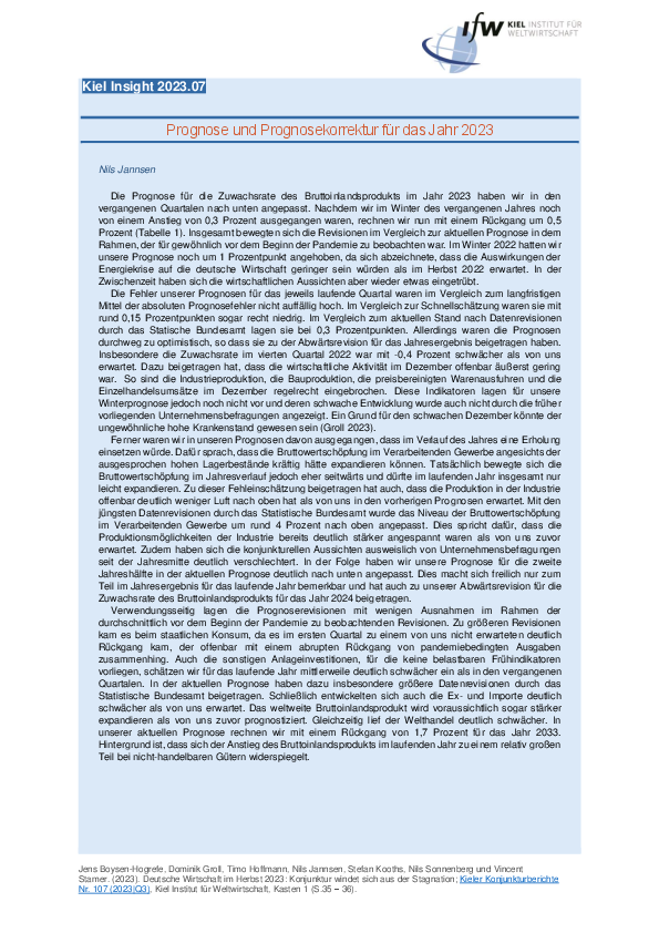 Die Prognose für die Zuwachsrate des Bruttoinlandsprodukts im Jahr 2023 haben wir in den vergangenen Quartalen nach unten angepasst. Nachdem wir im Winter des vergangenen Jahres noch von einem Anstieg von 0,3 Prozent ausgegangen waren, rechnen wir nun mit einem Rückgang um 0,5 Prozent (Tabelle 1). Insgesamt bewegten sich die Revisionen im Vergleich zur aktuellen Prognose in dem Rahmen, der für gewöhnlich vor dem Beginn der Pandemie zu beobachten war. Im Winter 2022 hatten wir unsere Prognose noch um 1 Prozentpunkt angehoben, da sich abzeichnete, dass die Auswirkungen der Energiekrise auf die deutsche Wirtschaft geringer sein würden als im Herbst 2022 erwartet. In der Zwischenzeit haben sich die wirtschaftlichen Aussichten aber wieder etwas eingetrübt.