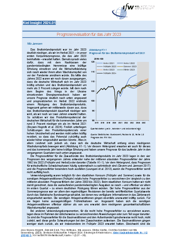Das Bruttoinlandsprodukt war im Jahr 2023 deutlich niedriger, als wir im Herbst 2021 – in unser ersten Konjunkturprognose, die das Jahr 2023 beinhaltete – erwartet hatten. Damals sprach vieles dafür, dass mit dem Nachlassen der pandemiebedingten Hemmnisse eine kräftige Erholung einsetzen und die Wirtschaftsleistung sich rasch wieder ihrem alten Wachstumspfad von vor der Pandemie annähern würde.