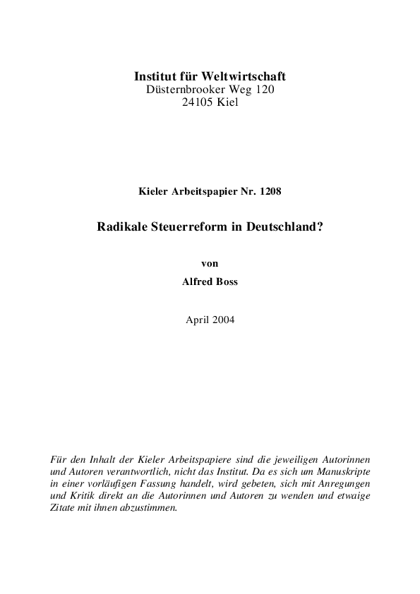 Trotz der Steuersenkungen zum Jahresbeginn 2004 und zum Jahresbeginn 2005 gibt es zahlreiche Vorschläge zur Reform der Einkommensteuer. Sie zielen darauf ab, die Steuersätze deutlich zu verringern und die Steuervergünstigungen zu reduzieren oder gar abzuschaffen und letztlich das Steuerrecht zu vereinfachen. Einige Vorschläge werden dargestellt und unter Effizienzgesichtspunkten bewertet; die Einführung einer dualen Einkommensteuer z.B. wäre ein großer Schritt in Richtung auf mehr Effizienz. Vermutlich wird es aber in absehbarer Zeit nicht zu einer radikalen Reform kommen, weil dem Widerstände verschiedener Interessengruppen entgegenstehen.