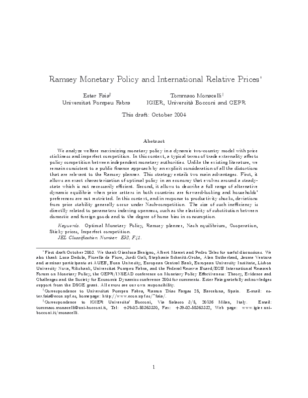 stickiness and imperfect competition. In this context, a typical terms of trade externality affects policy competition between independent monetary authorities. Unlike the existing literature, we remain consistent to a public finance approach by an explicit consideration of all the distortions that are relevant to the Ramsey planner. This strategy entails two main advantages. First, it allows an exact characterization of optimal policy in an economy that evolves around a steadystate which is not necessarily efficient. Second, it allows to describe a full range of alternative dynamic equilibria when price setters in both countries are forward-looking and households’ preferences are not restricted. In this context, and in response to productivity shocks, deviations from price stability generally occur under Nash-competition. The size of such inefficiency is directlly related to parameters indexing openness, such as the elasticity of substitution between domestic and foreign goods and to the degree of home bias in consumption.