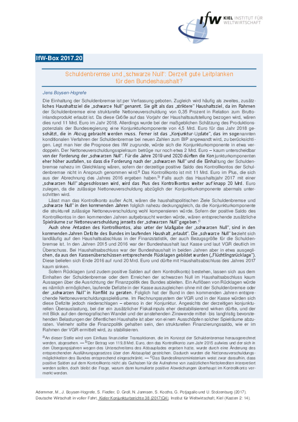 Die Einhaltung der Schuldenbremse ist per Verfassung geboten. Zugleich wird häufig als zweites, zusätz-liches Haushaltsziel die „schwarze Null“ genannt. Sie gilt als das „striktere“ Haushaltsziel, da im Rahmen der Schuldenbremse eine strukturelle Nettoneuverschuldung von 0,35 Prozent in Relation zum Brutto-inlandsprodukt erlaubt ist. Da diese Größe auf das Vorjahr der Haushaltsaufstellung bezogen wird, wären dies rund 11 Mrd. Euro im Jahr 2018. Allerdings wurde bei der maßgeblichen Schätzung des Produktions-potenzials der Bundesregierung eine Konjunkturkomponente von 4,5 Mrd. Euro für das Jahr 2018 ge-schätzt, die in Abzug gebracht werden muss. Ferner ist das „Konjunktur-Update“, das im sogenannten konditionalen Verfahren der Schuldenbremse bei neuen Zahlen zum BIP angewandt wird, zu berücksichti-gen. Legt man hier die Prognose des IfW zugrunde, würde sich die Konjunkturkomponente in etwa ver-doppeln. Der Nettoneuverschuldungsspielraum betrüge nur noch etwa 2 Mrd. Euro – kaum unterscheidbar von der Forderung der „schwarzen Null“. Für die Jahre 2019 und 2020 dürften die Konjunkturkomponenten eher höher ausfallen, so dass die Forderung nach der „schwarzen Null“ und die Einhaltung der Schulden-bremse nahezu im Gleichklang wären, sofern der derzeitige positive Saldo des Kontrollkontos der Schul-denbremse nicht in Anspruch genommen wird.a Das Kontrollkonto ist mit 11 Mrd. Euro im Plus, die sich aus der Abrechnung des Jahres 2016 ergeben haben.b Falls auch das Haushaltsjahr 2017 mit einer „schwarzen Null“ abgeschlossen wird, wird das Plus des Kontrollkontos weiter auf knapp 20 Mrd. Euro zulegen, da die zulässige Nettoneuverschuldung abzüglich der Konjunkturkomponente abermals unter-schritten wird.