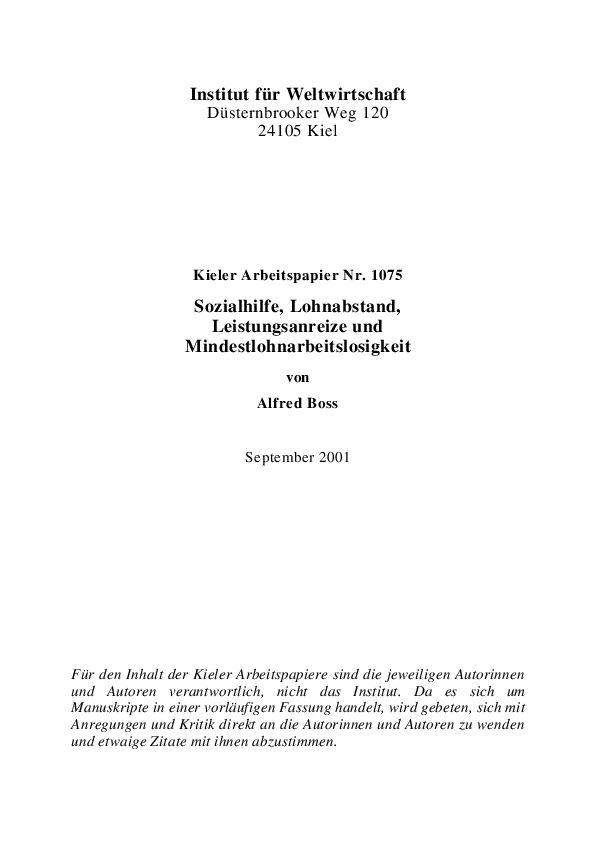 Sozialhilfe, Lohnabstand, Leistungsanreize und Mindestlohnarbeitslosigkeit