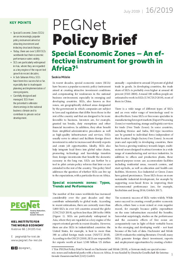 Special Economic Zones (SEZs), or free zones, are an increasingly popular policy instrument aimed at attracting investment and inducing structural change. They are geographically defined areas designated by the government where regulations are designed to be more favorable to business than at the national level. The main goals of the creation of SEZs are, inter alia, the facilitation of foreign direct investments, the diversification of exports, and the creation of job opportunities. However, do SEZs meet those expectations and can they therefore be seen as an effective instrument for growth? The 16th PEGNet Policy Brief examines this question with a particular focus on Africa.