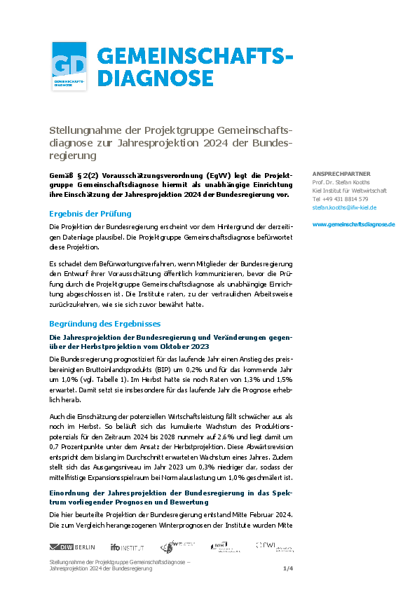 Stellungnahme der Projektgruppe Gemeinschaftsdiagnose zur Jahresprojektion 2024 der Bundesregierung