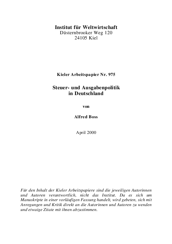 Der Kurs der Finanzpolitik in Deutschland hat sich im Verlauf des Jahres 1999 geändert. Ausgabenkürzungen wurden durchgesetzt, deutliche Steuersenkungen sind geplant. Die Finanzpolitik fördert das Wachstum der Wirtschaft. Allerdings sind die Steuersenkungen bei weitem nicht so groß wie oft behauptet; der Plan zur Reform der Unternehmensbesteuerung enthält etliche Mängel.