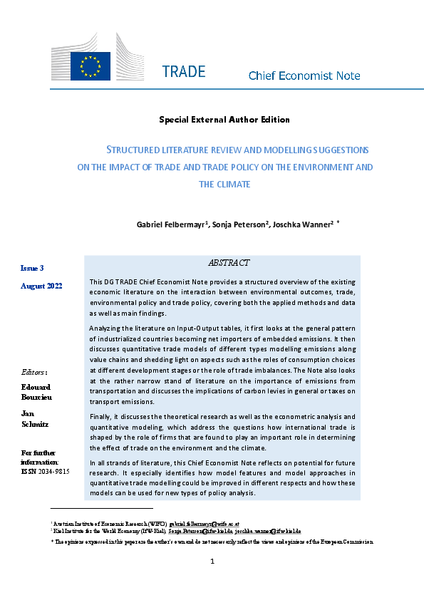 This DG TRADE Chief Economist Note provides a structured overview of the existing economic literature on the interaction between environmental outcomes, trade, environmental policy and trade policy, covering both the applied methods and data as well as main findings.