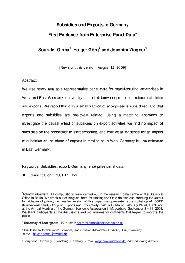 Subsidies and Exports in Germany: First Evidence from Enterprise Panel Data