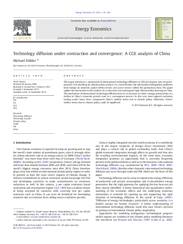 Technology diffusion under contraction and convergence: A CGE analysis of China