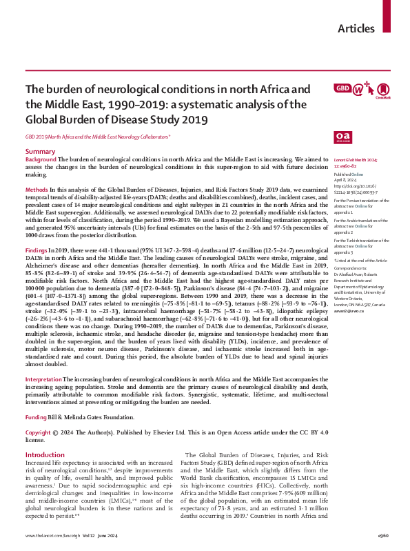 In this analysis of the Global Burden of Diseases, Injuries, and Risk Factors Study 2019 data, we examined temporal trends of disability-adjusted life-years (DALYs; deaths and disabilities combined), deaths, incident cases, and prevalent cases of 14 major neurological conditions and eight subtypes in 21 countries in the north Africa and the Middle East super-region. Additionally, we assessed neurological DALYs due to 22 potentially modifiable risk factors, within four levels of classification, during the period 1990–2019. We used a Bayesian modelling estimation approach, and generated 95% uncertainty intervals (UIs) for final estimates on the basis of the 2·5th and 97·5th percentiles of 1000 draws from the posterior distribution.