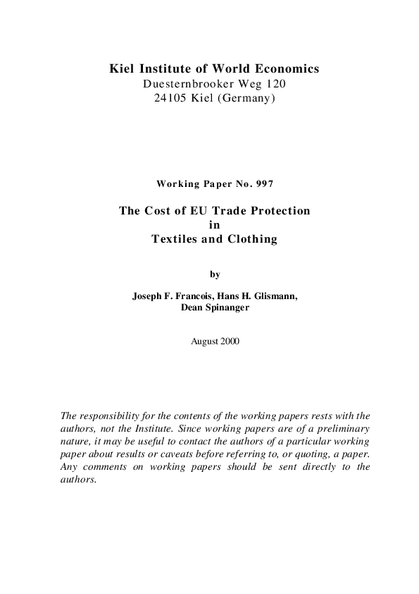 This paper estimates the costs of EU restraints on trade in textiles and clothing. After explaining the methods used, we examine the impact of an opening up of EU trade in textiles and clothing, inter alia to those economies where the textile and clothing (T&C) industries command sizeable shares of exports and output. The estimates are based, firstly, on a partial equilibrium analysis allowing us to directly cover the effects of liberalization on the importation, production and consumption of T&C products; secondly, a general equilibrium analysis incorporates the wide-sweeping indirect costs of ATC within the EU. It turns out that in 1997 EU consumers paid roughly ECU 25 billion more for T&C products, due to quotas, tariffs and indirect effects.