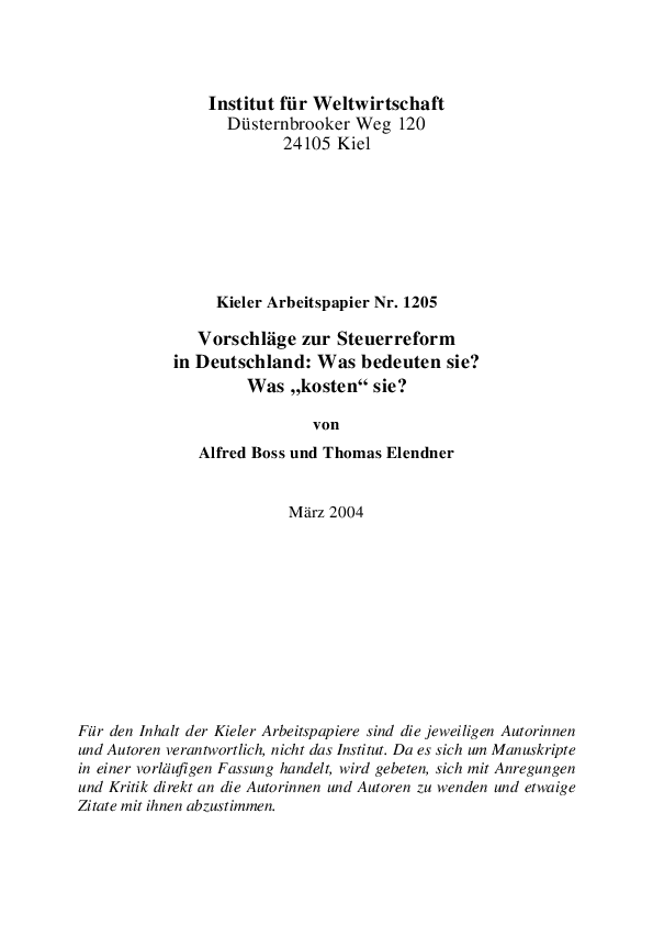 Eine Steuerreform in Deutschland wird sowohl von Seiten der Wissenschaft als auch von Parteien vorgeschlagen. Mithilfe einer Fortschreibung der Ergebnisse der Lohnsteuerstatistik 1998 werden die finanziellen Auswirkungen der Einführung alternativer Steuertarife (u.a. der von F. Merz, H. O. Solms und P. Kirchhof vorgeschlagenen Tarife) untersucht. Auch die Konsequenzen für das gesamte Einkommensteueraufkommen werden geschätzt. Es zeigt sich, dass es möglich ist, die Grenzsteuersätze deutlich zu senken, ohne dass das Steueraufkommen wesentlich sinkt; es müssen dann allerdings alle Steuervergünstigungen gestrichen werden.
