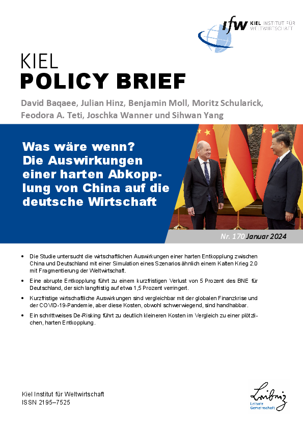 Wie würde die deutsche Wirtschaft eine harte wirtschaftliche Abkopplung von China bewältigen? Um dem nachzugehen, simulieren die Autoren mithilfe eines quantitativen Handelsmodels ein Szenario, in dem sich die Weltwirtschaft in drei Blöcke aufspaltet: die G7-Staaten und ihre Verbündeten, China mit seinen Verbündeten sowie neutrale Länder. Der Handel Deutschlands mit China müsste komplett auf Länder des „westlichen“ Blocks und neutrale Staaten umgeleitet werden. Die Kosten einer solchen worst-case harten Entkopplung quantifizieren die Autoren mit dem Multisektor-Modell der Weltwirtschaft von Baqaee und Farhi (2021). Die zentrale Erkenntnis der Autoren ist, dass ein vollständiger Abbruch der Handelsbeziehungen mit China schwerwiegende, aber nicht katastrophale Auswirkungen auf die deutsche Wirtschaft haben würde. Der Wohlfahrtsverlust für Deutschland würde sich in den ersten Monaten auf etwa 5 Prozent des Bruttonationaleinkommens (BNE) belaufen und im Laufe des ersten Jahres auf etwa 4 Prozent sinken, zusätzlich zu weiteren kurzfristigen Kosten durch konjunkturelle Verstärkungseffekte. Mittel- bis langfristig würden die Kosten auf einen dauerhaften Wohlstandsverlust von 1–2 Prozent zurückgehen. Weniger extreme Abkopplungsvarianten oder eine schrittweise Risikominimierung (“small yard, high fence") würden geringere Kosten verursachen. Die wichtigste Annahme in der Simulation betrifft die Handelselastizität, also die Leichtigkeit und Geschwindigkeit, mit der der Handel von China auf neutrale Länder und innerhalb des westlichen Blocks umgestellt werden kann. Die Ergebnisse des Policy Briefs, insbesondere die deutliche Abhängigkeit der wirtschaftlichen Kosten vom Anpassungszeitraum, bieten Argumente für einen schrittweisen Risikominimierungspfad, um eine teure und politisch kontroverse harte Abkopplung zu vermeiden, die durch geopolitische Ereignisse erzwungen werden könnte.