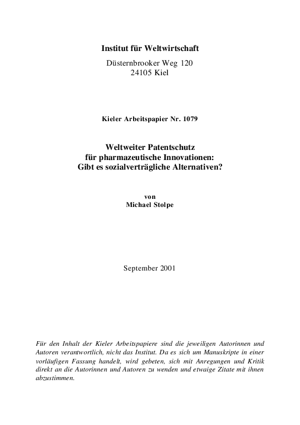 Weltweiter Patentschutz für pharmazeutische Innovationen: Gibt es sozialverträgliche Alternativen?