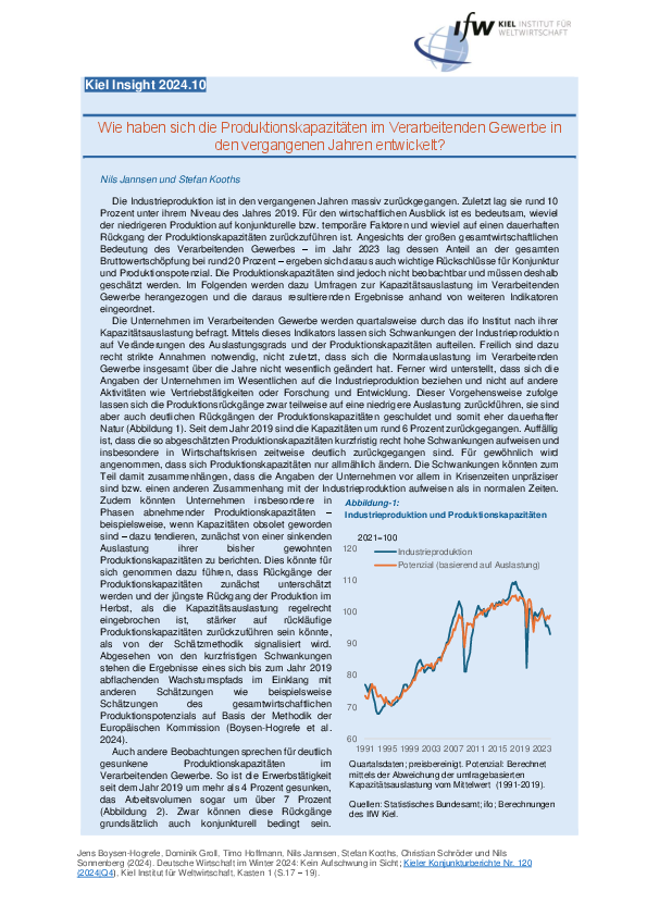 Die Industrieproduktion ist in den vergangenen Jahren massiv zurückgegangen. Zuletzt lag sie rund 10 Prozent unter ihrem Niveau des Jahres 2019. Für den wirtschaftlichen Ausblick ist es bedeutsam, wieviel der niedrigeren Produktion auf konjunkturelle bzw. temporäre Faktoren und wieviel auf einen dauerhaften Rückgang der Produktionskapazitäten zurückzuführen ist. Angesichts der großen gesamtwirtschaftlichen Bedeutung des Verarbeitenden Gewerbes – im Jahr 2023 lag dessen Anteil an der gesamten Bruttowertschöpfung bei rund 20 Prozent – ergeben sich daraus auch wichtige Rückschlüsse für Konjunktur und Produktionspotenzial. Die Produktionskapazitäten sind jedoch nicht beobachtbar und müssen deshalb geschätzt werden. Im Folgenden werden dazu Umfragen zur Kapazitätsauslastung im Verarbeitenden Gewerbe herangezogen und die daraus resultierenden Ergebnisse anhand von weiteren Indikatoren eingeordnet.