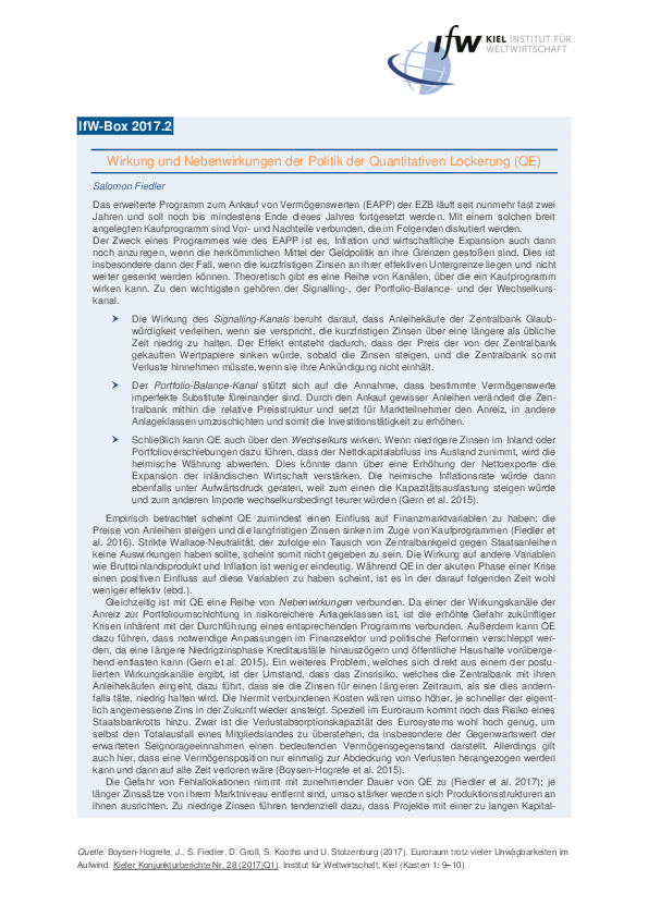 Das erweiterte Programm zum Ankauf von Vermögenswerten (EAPP) der EZB läuft seit nunmehr fast zwei Jahren und soll noch bis mindestens Ende dieses Jahres fortgesetzt werden. Mit einem solchen breit angelegten Kaufprogramm sind Vor- und Nachteile verbunden, die im Folgenden diskutiert werden. Der Zweck eines Programmes wie des EAPP ist es, Inflation und wirtschaftliche Expansion auch dann noch anzuregen, wenn die herkömmlichen Mittel der Geldpolitik an ihre Grenzen gestoßen sind. Dies ist insbesondere dann der Fall, wenn die kurzfristigen Zinsen an ihrer effektiven Untergrenze liegen und nicht weiter gesenkt werden können. Theoretisch gibt es eine Reihe von Kanälen, über die ein Kaufprogramm wirken kann. Zu den wichtigsten gehören der Signalling-, der Portfolio-Balance- und der Wechselkurs-kanal.