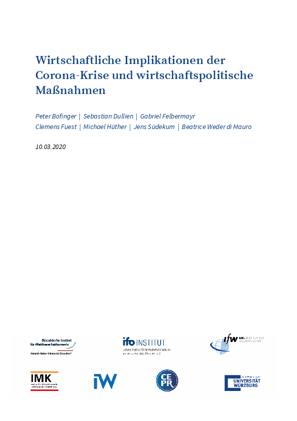 In diesem Papier unterstützt eine Gruppe von prominenten Wirtschaftswissenschaftlern das Hilfspaket der Bundesregierung vom März 2020 für die Wirtschaft in der Corona-Krise. Gleichzeitig jedoch fordern sie die Regierung auf, mehr zu tun. Es seien weitergehende Schritte notwendig. Wenn erforderlich, müsse zur Behebung der wirtschaftlichen Auswirkungen der Corona-Krise von der Schwarzen Null im Staatshaushalt abgewichen werden, und es seien die Spielräume zu nutzen, die die Schuldenbremse biete.