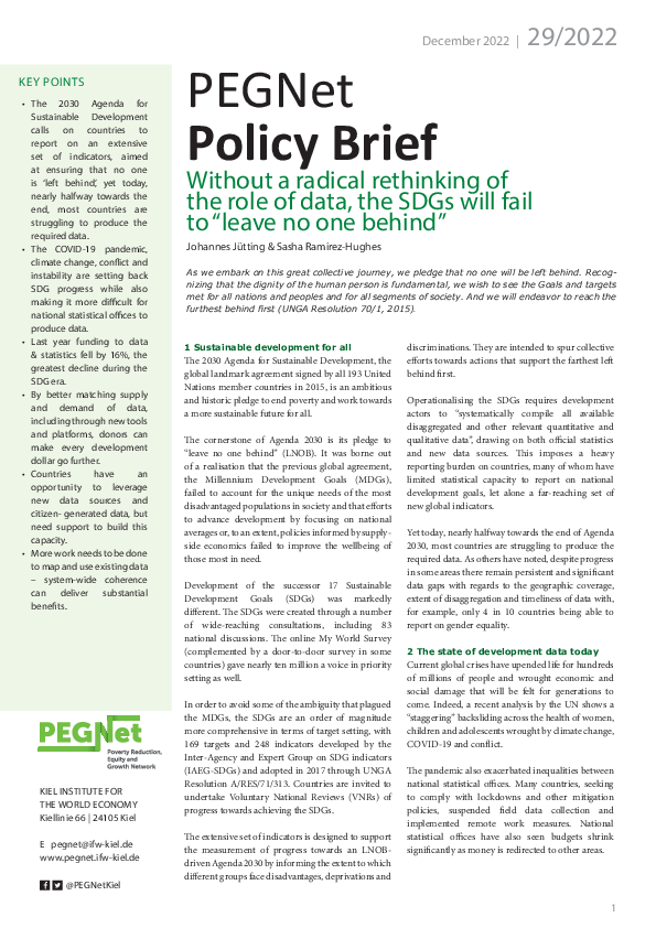 The 2030 Agenda for Sustainable Development calls on countries to report on an extensive set of indicators, aimed at ensuring that no one is ‘left behind’, yet today, nearly halfway towards the end, most countries are struggling to produce the required data. The COVID-19 pandemic, climate change, conflict and instability are setting back SDG progress while also making it more difficult for national statistical offices to produce data. Johannes Jütting & Sasha Ramirez-Hughes suggest in their Policy Brief to use new tools and platforms to better match supply and demand, new data sources and citizen-generated data along with the better usage of existing data that could deliver substantial benefits.