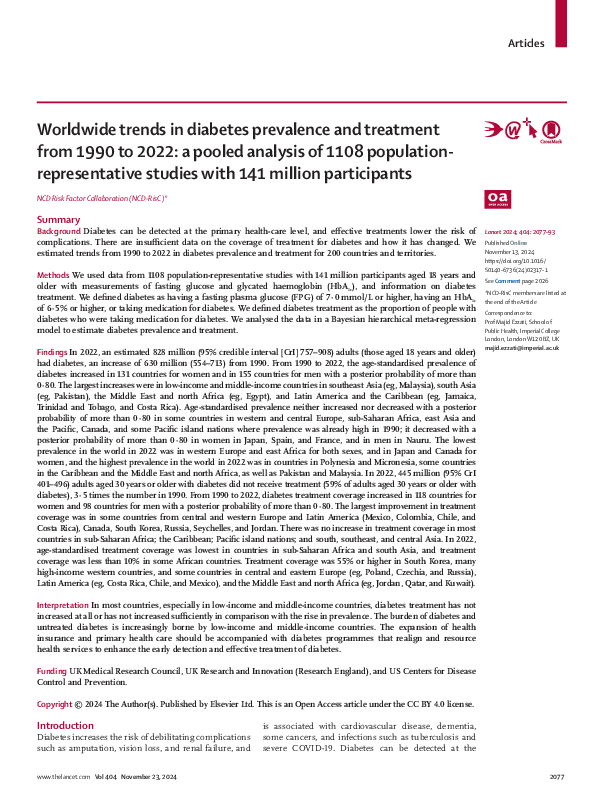 Methods: We used data from 1108 population-representative studies with 141 million participants aged 18 years and older with measurements of fasting glucose and glycated haemoglobin (HbA1c), and information on diabetes treatment. We defined diabetes as having a fasting plasma glucose (FPG) of 7·0 mmol/L or higher, having an HbA1cof 6·5% or higher, or taking medication for diabetes. We defined diabetes treatment as the proportion of people with diabetes who were taking medication for diabetes. We analysed the data in a Bayesian hierarchical meta-regression model to estimate diabetes prevalence and treatment. Findings In 2022, an estimated 828 million (95% credible interval [CrI] 757–908) adults (those aged 18 years and older) had diabetes, an increase of 630 million (554–713) from 1990. From 1990 to 2022, the age-standardised prevalence of diabetes increased in 131 countries for women and in 155 countries for men with a posterior probability of more than 0·80. The largest increases were in low-income and middle-income countries in southeast Asia (eg, Malaysia), south Asia (eg, Pakistan), the Middle East and north Africa (eg, Egypt), and Latin America and the Caribbean (eg, Jamaica, Trinidad and Tobago, and Costa Rica). Age-standardised prevalence neither increased nor decreased with a posterior probability of more than 0·80 in some countries in western and central Europe, sub-Saharan Africa, east Asia and the Pacific, Canada, and some Pacific island nations where prevalence was already high in 1990; it decreased with a posterior probability of more than 0·80 in women in Japan, Spain, and France, and in men in Nauru. The lowest prevalence in the world in 2022 was in western Europe and east Africa for both sexes, and in Japan and Canada for women, and the highest prevalence in the world in 2022 was in countries in Polynesia and Micronesia, some countries in the Caribbean and the Middle East and north Africa, as well as Pakistan and Malaysia. In 2022, 445 million (95% CrI 401–496) adults aged 30 years or older with diabetes did not receive treatment (59% of adults aged 30 years or older with diabetes), 3·5 times the number in 1990. From 1990 to 2022, diabetes treatment coverage increased in 118 countries for women and 98 countries for men with a posterior probability of more than 0·80. The largest improvement in treatment coverage was in some countries from entral and western Europe and Latin America (Mexico, Colombia, Chile, and Costa Rica), Canada, South Korea, Russia, Seychelles, and Jordan. There was no increase in treatment coverage in most countries in sub-Saharan Africa; the Caribbean; Pacific island nations; and south, southeast, and central Asia. In 2022, age-standardised treatment coverage was lowest in countries in sub-Saharan Africa and south Asia, and treatment coverage was less than 10% in some African countries. Treatment coverage was 55% or higher in South Korea, many high-income western countries, and some countries in central and eastern Europe (eg, Poland, Czechia, and Russia), Latin America (eg, Costa Rica, Chile, and Mexico), and the Middle East and north Africa (eg, Jordan, Qatar, and Kuwait).