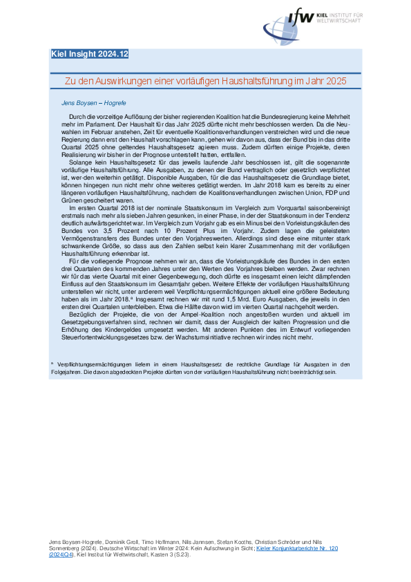 Durch die vorzeitige Auflösung der bisher regierenden Koalition hat die Bundesregierung keine Mehrheit mehr im Parlament. Der Haushalt für das Jahr 2025 dürfte nicht mehr beschlossen werden. Da die Neu-wahlen im Februar anstehen, Zeit für eventuelle Koalitionsverhandlungen verstreichen wird und die neue Regierung dann erst den Haushalt vorschlagen kann, gehen wir davon aus, dass der Bund bis in das dritte Quartal 2025 ohne geltendes Haushaltsgesetz agieren muss. Zudem dürften einige Projekte, deren Realisierung wir bisher in der Prognose unterstellt hatten, entfallen.
