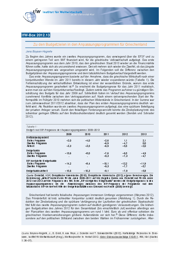 Zu Beginn des Jahres wurde ein zweites Anpassungsprogramm, das vorwiegend über die EFSF und zu einem geringeren Teil vom IWF finanziert wird, für die griechische Volkswirtschaft aufgelegt. Das erste Anpassungsprogramm aus dem Jahr 2010, das den griechischen Staat 2013 wieder an die Finanzmärkte führen sollte, hatte sich als unzureichend erwiesen. Derzeit mehren sich wieder die Zweifel, ob das jüngste Anpassungsprogramm wie vorgesehen umgesetzt wird. Im Folgenden soll die Differenz zwischen den Budgetplänen der Anpassungsprogramme und dem tatsächlichem Budgetverlauf dargestellt werden.