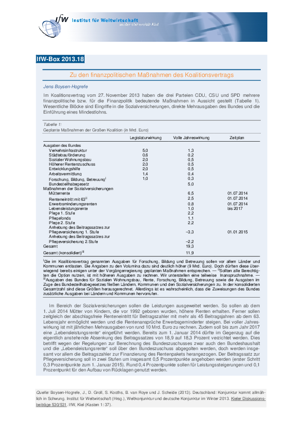 Im Koalitionsvertrag vom 27. November 2013 haben die drei Parteien CDU, CSU und SPD mehrere finanzpolitische bzw. für die Finanzpolitik bedeutende Maßnahmen in Aussicht gestellt. Wesentliche Blöcke sind Eingriffe in die Sozialversicherungen, direkte Mehrausgaben des Bundes und die Einführung eines Mindestlohns.