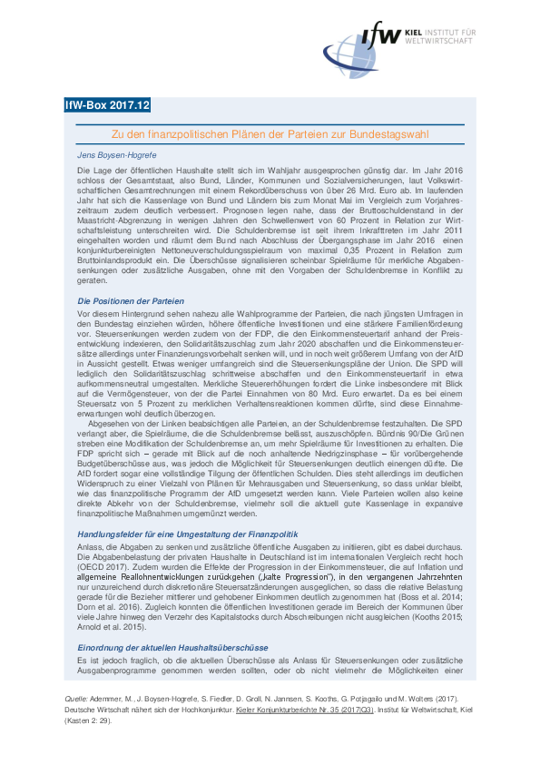 Die Lage der öffentlichen Haushalte stellt sich im Wahljahr ausgesprochen günstig dar. Im Jahr 2016 schloss der Gesamtstaat, also Bund, Länder, Kommunen und Sozialversicherungen, laut Volkswirt-schaftlichen Gesamtrechnungen mit einem Rekordüberschuss von über 26 Mrd. Euro ab. Im laufenden Jahr hat sich die Kassenlage von Bund und Ländern bis zum Monat Mai im Vergleich zum Vorjahres-zeitraum zudem deutlich verbessert. Prognosen legen nahe, dass der Bruttoschuldenstand in der Maastricht-Abgrenzung in wenigen Jahren den Schwellenwert von 60 Prozent in Relation zur Wirt-schaftsleistung unterschreiten wird. Die Schuldenbremse ist seit ihrem Inkrafttreten im Jahr 2011 eingehalten worden und räumt dem Bund nach Abschluss der Übergangsphase im Jahr 2016 einen konjunkturbereinigten Nettoneuverschuldungsspielraum von maximal 0,35 Prozent in Relation zum Bruttoinlandsprodukt ein. Die Überschüsse signalisieren scheinbar Spielräume für merkliche Abgaben-senkungen oder zusätzliche Ausgaben, ohne mit den Vorgaben der Schuldenbremse in Konflikt zu geraten.