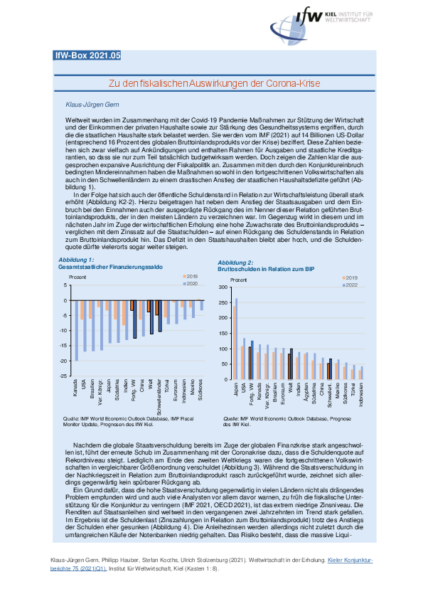 Weltweit wurden im Zusammenhang mit der Covid-19 Pandemie Maßnahmen zur Stützung der Wirtschaft und der Einkommen der privaten Haushalte sowie zur Stärkung des Gesundheitssystems ergriffen, durch die die staatlichen Haushalte stark belastet werden. Sie werden vom IMF (2021) auf 14 Billionen US-Dollar (entsprechend 16 Prozent des globalen Bruttoinlandsprodukts vor der Krise) beziffert. Diese Zahlen beziehen sich zwar vielfach auf Ankündigungen und enthalten Rahmen für Ausgaben und staatliche Kreditgarantien, so dass sie nur zum Teil tatsächlich budgetwirksam werden. Doch zeigen die Zahlen klar die ausgesprochen expansive Ausrichtung der Fiskalpolitik an. Zusammen mit den durch den Konjunktureinbruch bedingten Mindereinnahmen haben die Maßnahmen sowohl in den fortgeschrittenen Volkswirtschaften als auch in den Schwellenländern zu einem drastischen Anstieg der staatlichen Haushaltsdefizite geführt