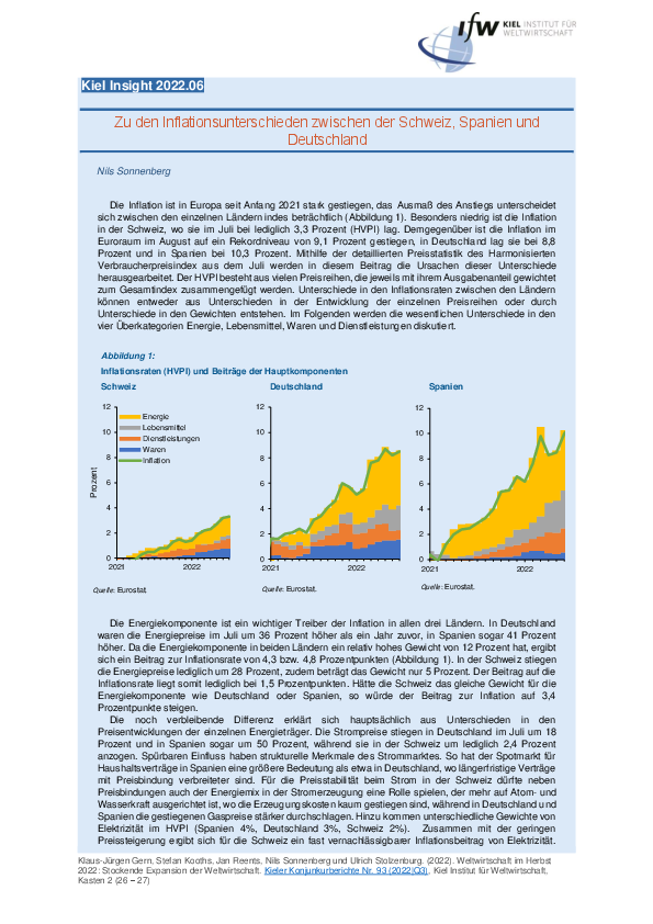 Die Inflation ist in Europa seit Anfang 2021 stark gestiegen, das Ausmaß des Anstiegs unterscheidet sich zwischen den einzelnen Ländern indes beträchtlich. Besonders niedrig ist die Inflation in der Schweiz, wo sie im Juli bei lediglich 3,3 Prozent (HVPI) lag. Demgegenüber ist die Inflation im Euroraum im August auf ein Rekordniveau von 9,1 Prozent gestiegen, in Deutschland lag sie bei 8,8 Prozent und in Spanien bei 10,3 Prozent. Mithilfe der detaillierten Preisstatistik des Harmonisierten Verbraucherpreisindex aus dem Juli werden in diesem Beitrag die Ursachen dieser Unterschiede herausgearbeitet. Der HVPI besteht aus vielen Preisreihen, die jeweils mit ihrem Ausgabenanteil gewichtet zum Gesamtindex zusammengefügt werden. Unterschiede in den Inflationsraten zwischen den Ländern können entweder aus Unterschieden in der Entwicklung der einzelnen Preisreihen oder durch Unterschiede in den Gewichten entstehen. Im Folgenden werden die wesentlichen Unterschiede in den vier Überkategorien Energie, Lebensmittel, Waren und Dienstleistungen diskutiert.