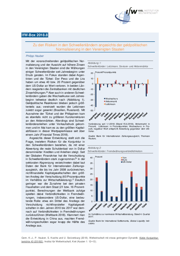 Mit der voranschreitenden geldpolitischen Normalisierung und der Aussicht auf höhere Zinsen in den Vereinigten Staaten sind die Währungen einiger Schwellenländer seit Jahresbeginn unter Druck geraten. Im Fokus standen dabei Argentinien und die Türkei: Der Peso und die Lira haben um etwa 40 bzw. 20 Prozent gegenüber dem US-Dollar an Wert verloren. In beiden Ländern reagierten die Zentralbanken mit deutlichen Zinserhöhungen.a Aber auch in anderen Schwellenländern gaben die Wechselkurse seit Jahres-beginn teilweise deutlich nach. Geldpolitische Reaktionen blieben jedoch größtenteils aus; vereinzelt wurden die Leitzinsen zuletzt sogar gesenkt (Brasilien, Russland). Mit Ausnahme der Türkei und der Philippinen kam es ebenfalls nicht zu größeren Kurskorrekturen an den Aktienmärkten. Allerdings sind Schwellenländeranleihen unter Verkaufsdruck gekommen und im Mai kam es zu den größten Kapitalabflüssen in dieser Wertpapierklasse seit über einem Jahr.