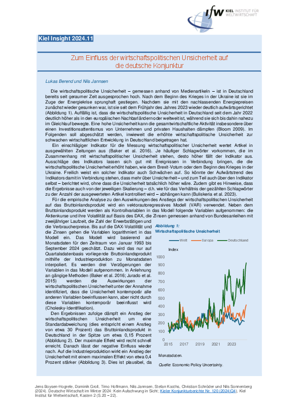 Die wirtschaftspolitische Unsicherheit – gemessen anhand von Medienartikeln – ist in Deutschland bereits seit geraumer Zeit ausgesprochen hoch. Nach dem Beginn des Krieges in der Ukraine ist sie im Zuge der Energiekrise sprunghaft gestiegen. Nachdem sie mit den nachlassenden Energiepreisen zunächst wieder gesunken war, ist sie seit dem Frühjahr des Jahres 2023 wieder deutlich aufwärtsgerichtet. Auffällig ist, dass die wirtschaftspolitische Unsicherheit in Deutschland seit dem Jahr 2022 deutlich höher als in den europäischen Nachbarländern oder weltweit ist, während sie sich bis dahin nahezu im Gleichlauf bewegte. Eine hohe Unsicherheit kann die gesamtwirtschaftliche Aktivität insbesondere über einen Investitionsattentismus von Unternehmen und privaten Haushalten dämpfen (Bloom 2009). Im Folgenden soll abgeschätzt werden, inwieweit die erhöhte wirtschaftspolitische Unsicherheit zur schwachen wirtschaftlichen Entwicklung in Deutschland beigetragen hat.