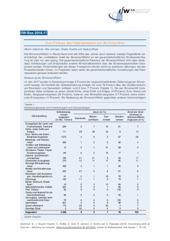 Die Binnenschifffahrt in Deutschland wird seit Mitte des Jahres durch äußerst niedrige Pegelstände beeinträchtigt. Der unmittelbare Anteil der Binnenschifffahrt an der gesamtwirtschaftlichen Bruttowertschöpfung ist zwar nur sehr gering. Die gesamtwirtschaftliche Relevanz der Binnenschifffahrt rührt aber daher, dass Vorleistungen und Endprodukte anderer Wirtschaftsbereiche über die Binnenwasserstraßen transportiert werden. Einschränkungen bei diesen Transporten können somit zu spürbaren Störungen bei den Produktionsketten führen. Im Folgenden sollen daher die gesamtwirtschaftlichen Auswirkungen des Niedrigwassers genauer analysiert werden.
