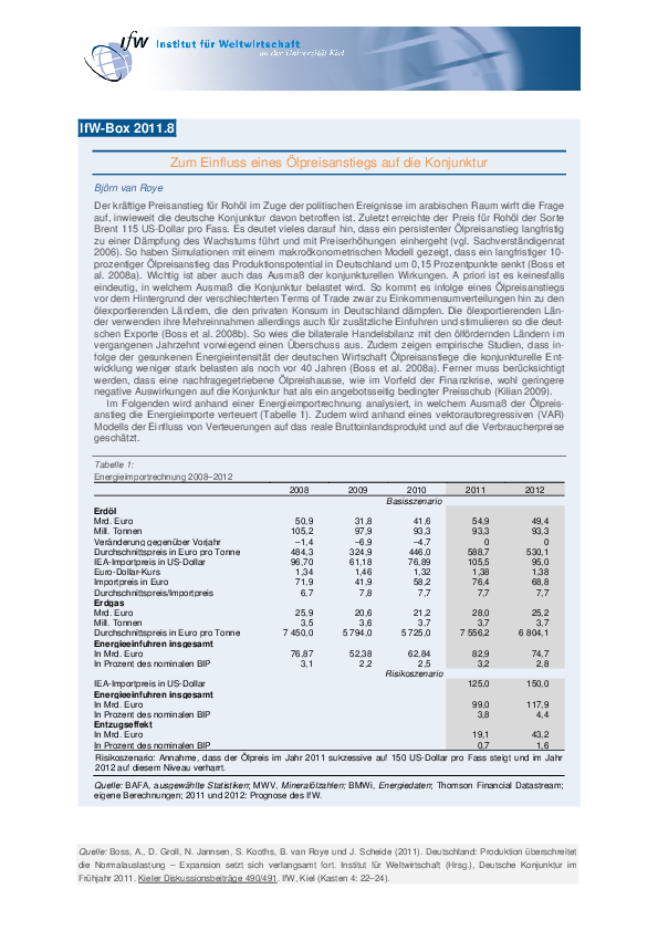 Der kräftige Preisanstieg für Rohöl im Zuge der politischen Ereignisse im arabischen Raum wirft die Frage auf, inwieweit die deutsche Konjunktur davon betroffen ist. Zuletzt erreichte der Preis für Rohöl der Sorte Brent 115 US-Dollar pro Fass. Es deutet vieles darauf hin, dass ein persistenter Ölpreisanstieg langfristig zu einer Dämpfung des Wachstums führt und mit Preiserhöhungen einhergeht (vgl. Sachverständigenrat 2006). So haben Simulationen mit einem makroökonometrischen Modell gezeigt, dass ein langfristiger 10-prozentiger Ölpreisanstieg das Produktionspotential in Deutschland um 0,15 Prozentpunkte senkt. Wichtig ist aber auch das Ausmaß der konjunkturellen Wirkungen.