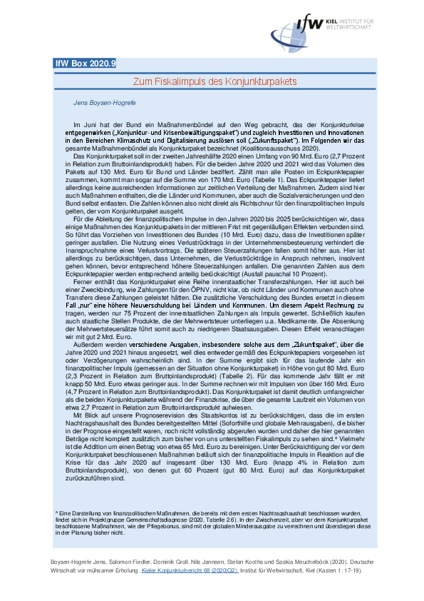 Im Juni hat der Bund ein Maßnahmenbündel auf den Weg gebracht, das der Konjunkturkrise entgegenwirken („Konjunktur- und Krisenbewältigungspaket“) und zugleich Investitionen und Innovationen in den Bereichen Klimaschutz und Digitalisierung auslösen soll („Zukunftspaket“). Im Folgenden wir das gesamte Maßnahmenbündel als Konjunkturpaket bezeichnet (Koalitionsausschuss 2020).