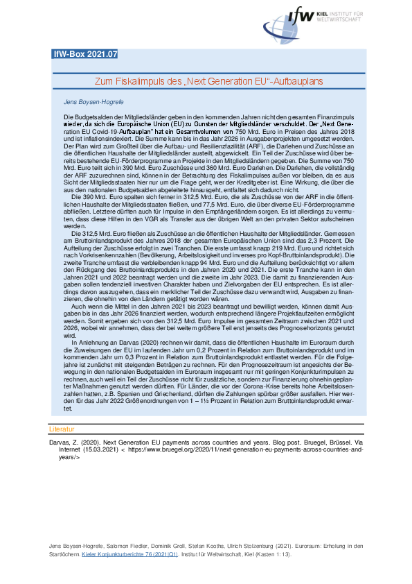 Die Budgetsalden der Mitgliedsländer geben in den kommenden Jahren nicht den gesamten Finanzimpuls wieder, da sich die Europäische Union (EU) zu Gunsten der Mitgliedsländer verschuldet. Der „Next Generation EU Covid-19-Aufbauplan“ hat ein Gesamtvolumen von 750 Mrd. Euro in Preisen des Jahres 2018 und ist inflationsindexiert. Die Summe kann bis in das Jahr 2026 in Ausgabenprojekten umgesetzt werden. Der Plan wird zum Großteil über die Aufbau- und Resilienzfazilität (ARF), die Darlehen und Zuschüsse an die öffentlichen Haushalte der Mitgliedsländer austeilt, abgewickelt. Ein Teil der Zuschüsse wird über bereits bestehende EU-Förderprogramme an Projekte in den Mitgliedsländern gegeben. Die Summe von 750 Mrd. Euro teilt sich in 390 Mrd. Euro Zuschüsse und 360 Mrd. Euro Darlehen. Die Darlehen, die vollständig der ARF zuzurechnen sind, können in der Betrachtung des Fiskalimpulses außen vor bleiben, da es aus Sicht der Mitgliedsstaaten hier nur um die Frage geht, wer der Kreditgeber ist. Eine Wirkung, die über die aus den nationalen Budgetsalden abgeleitete hinausgeht, entfaltet sich dadurch nicht.