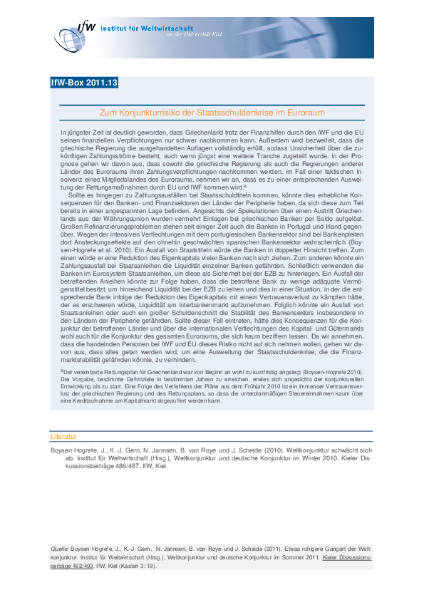 In jüngster Zeit ist deutlich geworden, dass Griechenland trotz der Finanzhilfen durch den IWF und die EU seinen finanziellen Verpflichtungen nur schwer nachkommen kann. Außerdem wird bezweifelt, dass die griechische Regierung die ausgehandelten Auflagen vollständig erfüllt, sodass Unsicherheit über die zukünftigen Zahlungsströme besteht, auch wenn jüngst eine weitere Tranche zugeteilt wurde. In der Prognose gehen wir davon aus, dass sowohl die griechische Regierung als auch die Regierungen anderer Länder des Euroraums ihren Zahlungsverpflichtungen nachkommen werden. Im Fall einer faktischen Insolvenz eines Mitgliedslandes des Euroraums, nehmen wir an, dass es zu einer entsprechenden Ausweitung der Rettungsmaßnahmen durch EU und IWF kommen wird.