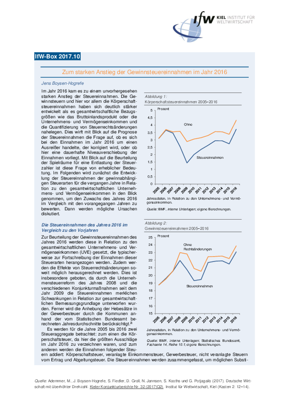 Im Jahr 2016 kam es zu einem unvorhergesehen starken Anstieg der Steuereinnahmen. Die Gewinnsteuern und hier vor allem die Körperschaftsteuereinnahmen haben sich deutlich stärker entwickelt als es gesamtwirtschaftliche Bezugsgrößen wie das Bruttoinlandsprodukt oder die Unternehmens- und Vermögenseinkommen und die Quantifizierung von Steuerrechtsänderungen nahelegen. Dies wirft mit Blick auf die Prognose der Steuereinnahmen die Frage auf, ob es sich bei den Einnahmen im Jahr 2016 um einen Ausreißer handelte, der korrigiert wird, oder ob hier eine dauerhafte Niveauverschiebung der Einnahmen vorliegt. Mit Blick auf die Beurteilung der Spielräume für eine Entlastung der Steuerzahler ist diese Frage von erheblicher Bedeutung. Im Folgenden wird zunächst die Entwick-lung der Steuereinnahmen der gewinnabhängigen Steuerarten für die vergangen Jahre in Rela-tion zu den gesamtwirtschaftlichen Unternehmens- und Vermögenseinkommen in den Blick genommen, um den Zuwachs des Jahres 2016 im Vergleich mit den vorangegangen Jahren zu bewerten. Dann werden mögliche Ursachen diskutiert.