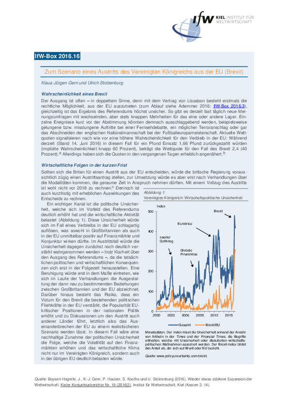 Der Ausgang ist offen – in doppeltem Sinne, denn mit dem Vertrag von Lissabon besteht erstmals die rechtliche Möglichkeit, aus der EU auszutreten, gleichzeitig ist das Ergebnis des Referendums höchst unsicher. So gibt es derzeit fast täglich neue Meinungsumfragen mit wechselnden, aber stets knappen Mehrheiten für das eine oder andere Lager. Einzelne Ereignisse kurz vor der Abstimmung könnten demnach ausschlaggebend werden, beispielsweise gelungene bzw. misslungene Auftritte bei einer Fernsehdebatte, ein möglicher Terroranschlag oder gar das Abschneiden der englischen Nationalmannschaft bei der Fußballeuropameisterschaft. Aktuelle Wettquoten signalisieren nach wie vor eine höhere Wahrscheinlichkeit für den Verbleib in der EU: Während derzeit (Stand 14. Juni 2016) in diesem Fall für ein Pfund Einsatz 1,66 Pfund zurückgezahlt würden (implizite Wahrscheinlichkeit knapp 60 Prozent), beträgt die Wettquote für den Fall des Brexit 2,4 (40 Prozent).Allerdings haben sich die Quoten in den vergangenen Tagen erheblich angenähert.