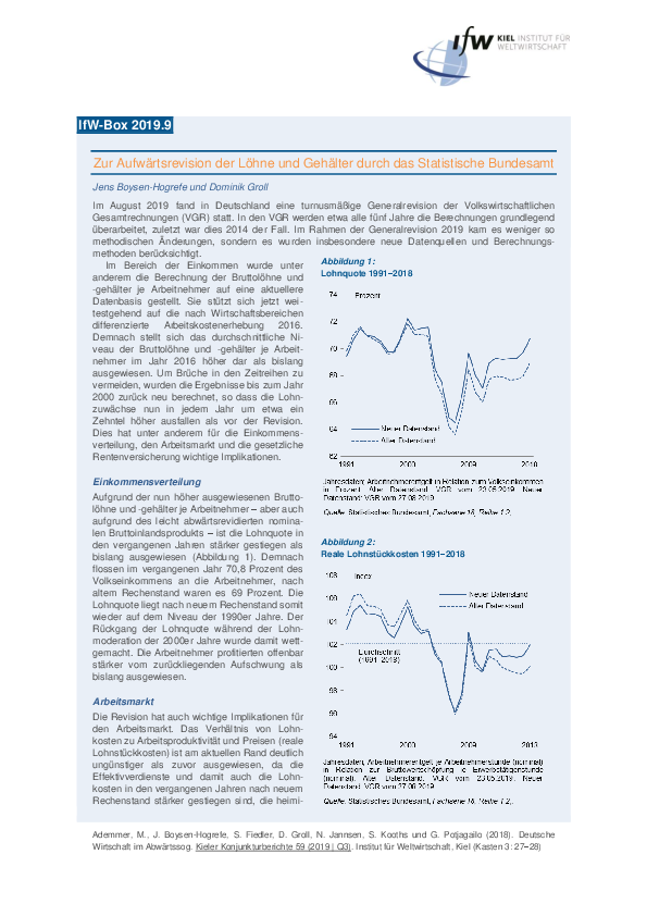 Im August 2019 fand in Deutschland eine turnusmäßige Generalrevision der Volkswirtschaftlichen Gesamtrechnungen (VGR) statt. In den VGR werden etwa alle fünf Jahre die Berechnungen grundlegend überarbeitet, zuletzt war dies 2014 der Fall. Im Rahmen der Generalrevision 2019 kam es weniger so methodischen Änderungen, sondern es wurden insbesondere neue Datenquellen und Berechnungsmethoden berücksichtigt. Dies hat unter anderem für die Einkommensverteilung, den Arbeitsmarkt und die gesetzliche Rentenversicherung wichtige Implikationen.